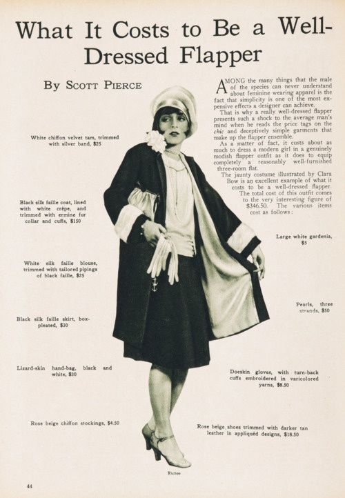 a person could furnish a three-bedroom flat for the same cost of buying the accompanying outfit, modeled by quintessential flapper girl Clara Bow.