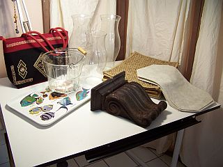 The first place I started grabbing from was the china cabinet in the same room. In ten minutes, I piled up rush placemats and plastic placemats. I also found 3, yes 3, hurricane lamps left over from a charity event I helped organize, and a glass ice bucket molded like an old oaken bucket…cute, but I can’t recall the last time I needed an ice bucket.