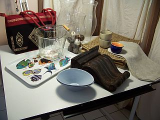 The fish tray’s another “cute-but-never-used” item and the ornate wall shelf/bracket has been a decorative piece in many rooms over 25 years. Time to let someone else enjoy it.