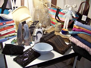 Oh, and the purse: red and black wool. I love it, but I live in southern Florida, and there is not a season in the year when a wool handbag looks right. Count so far: 9 items in 10 minutes. Not bad. (I’m counting sets as one item.)
