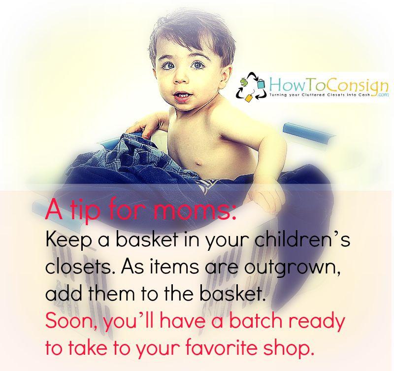 Keep a basket in your children’s closets to fill with outgrown or underloved clothing, toys, books. Soon, you’ll have a batch ready to take into the consignment or resale shop of your choice!